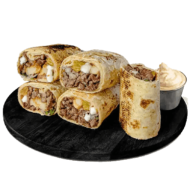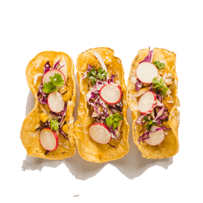 Crispy or soft tortillas filled with spiced meat, beans, cheese,